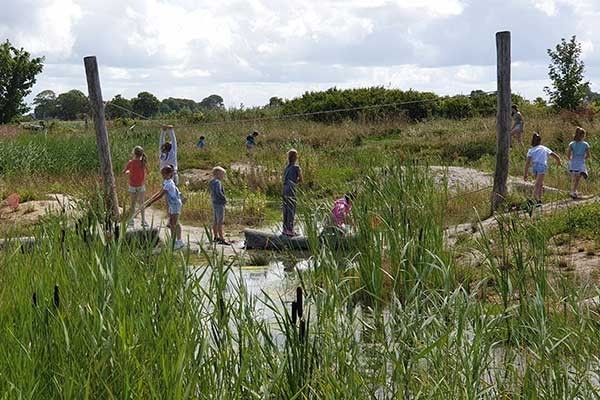 Zieh Deine Schuhe aus -und schon kann das Abenteuer beginnen! Auf dem Wattspielplatz gibt es Priele und Inseln, die Ebbe und Flut simulieren. Klettere an den Seilen auf die andere Seite und fang mit einem Fischernetz kleine Tiere im Wasser. Natürlich gibt es auch eine Stelle, wo Du nachher Deine Füße abspülen kannst. Deine Eltern können inzwischen auf der Terrasse des Sommerpavillons Platz nehmen und die Aussicht genießen.